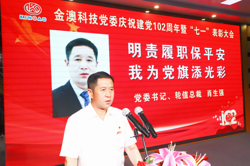 6月29日晚,金澳科技党委在多功能厅召开“党建引领聚合力 真抓实干促发展”——庆祝建党102周年暨“七一”表彰大会。全国优秀共产党员、金澳集团执行总裁吴让生出席会议,金澳科技党委书记、轮值总裁肖生强等党委领导班子成员及非当班党员、预备党员、入党积极分子、管理干部参加。