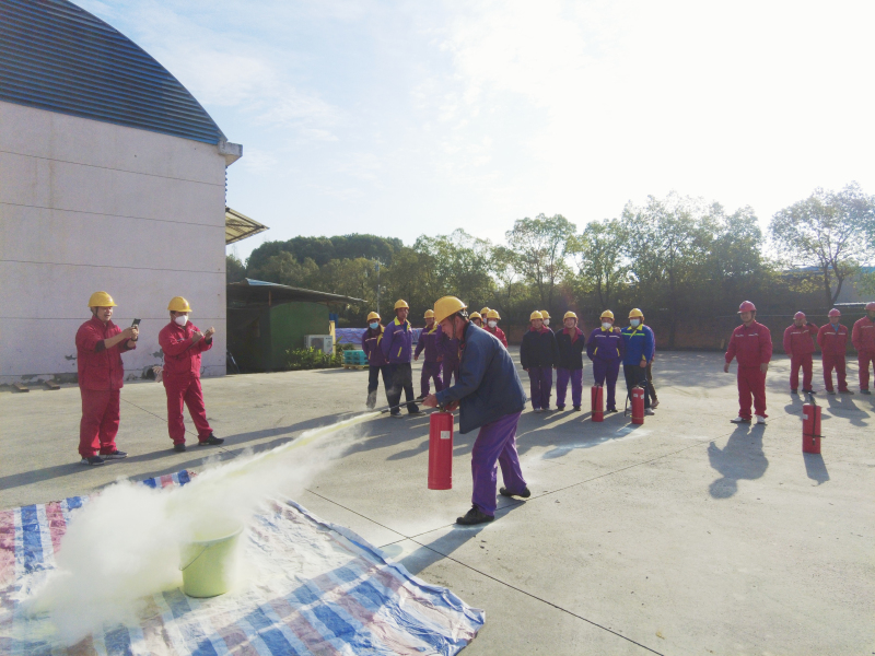 金源化工公司组织消防器材培训、外协人员灭火器比赛,化工党支部书记、总经理王平利,支部委员、副总经理陈波及聚丙烯车间干部员工、外协人员参加活动。
