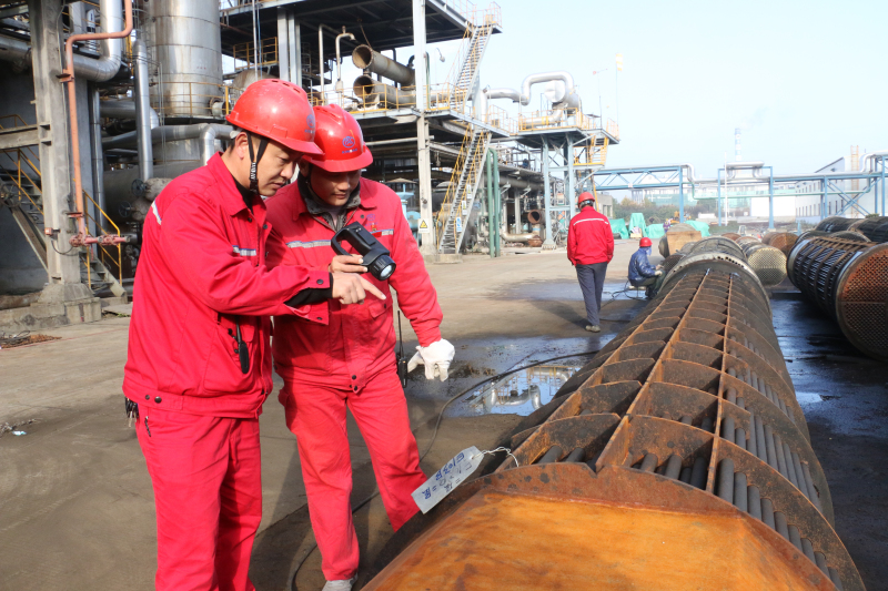 炼化党支部委员、副总经理乐德俊,党员、硫磺车间设备管理员徐蕾检查并监护老装置原料水与净化水换热器管束清洗情况。