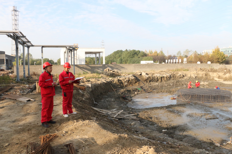 公司副总裁吴时斌,党员、综合事务处科员周恒平与施工单位、监理单位在监利-潜江输油管道项目监利输油站施工现场沟通施工进度。