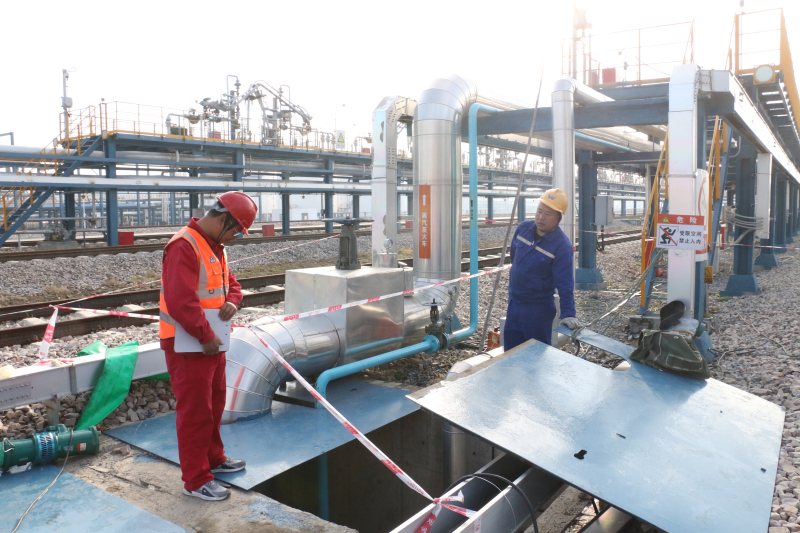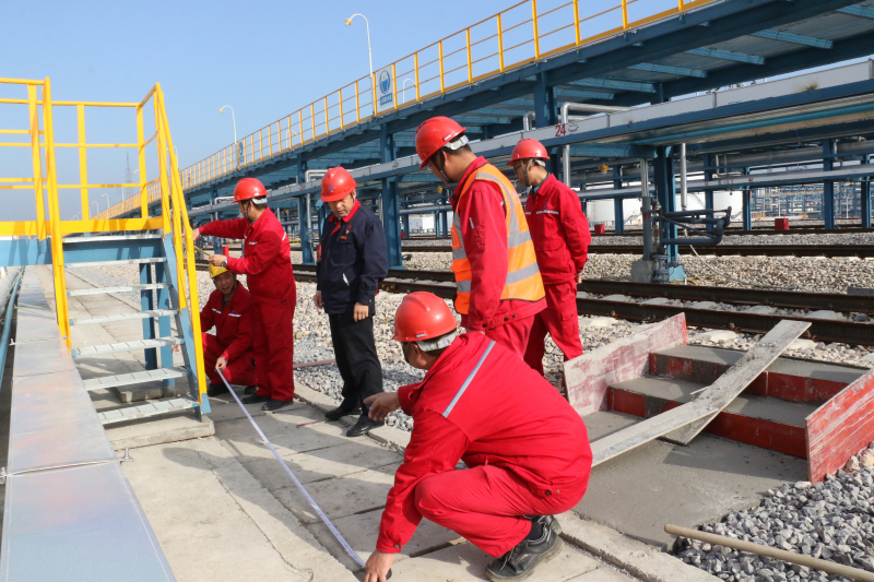 公司党委书记、轮值总裁肖生强与基建处处长姜玉鼎,党员、机修车间主任龙云理,党员、油品储运二公司油品车间主任刘子俊一同测量金澳铁路装卸站平台过桥尺寸,根据实际情况商讨改造方案。