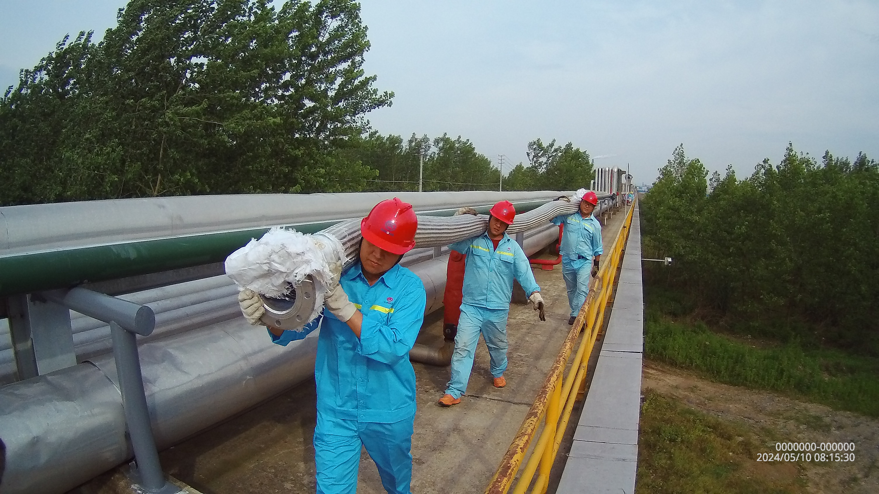 物流公司设备管理员张海红组织部分班长、员工将到库金属软管转运至码头指定位置,提前做好设备保障工作。